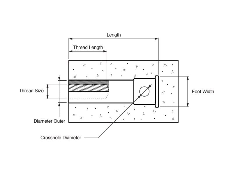 | SKU | Int. Thread x Overall Length: | Thread Insert: | Foot Shape: | Cross Hole Dia.: |